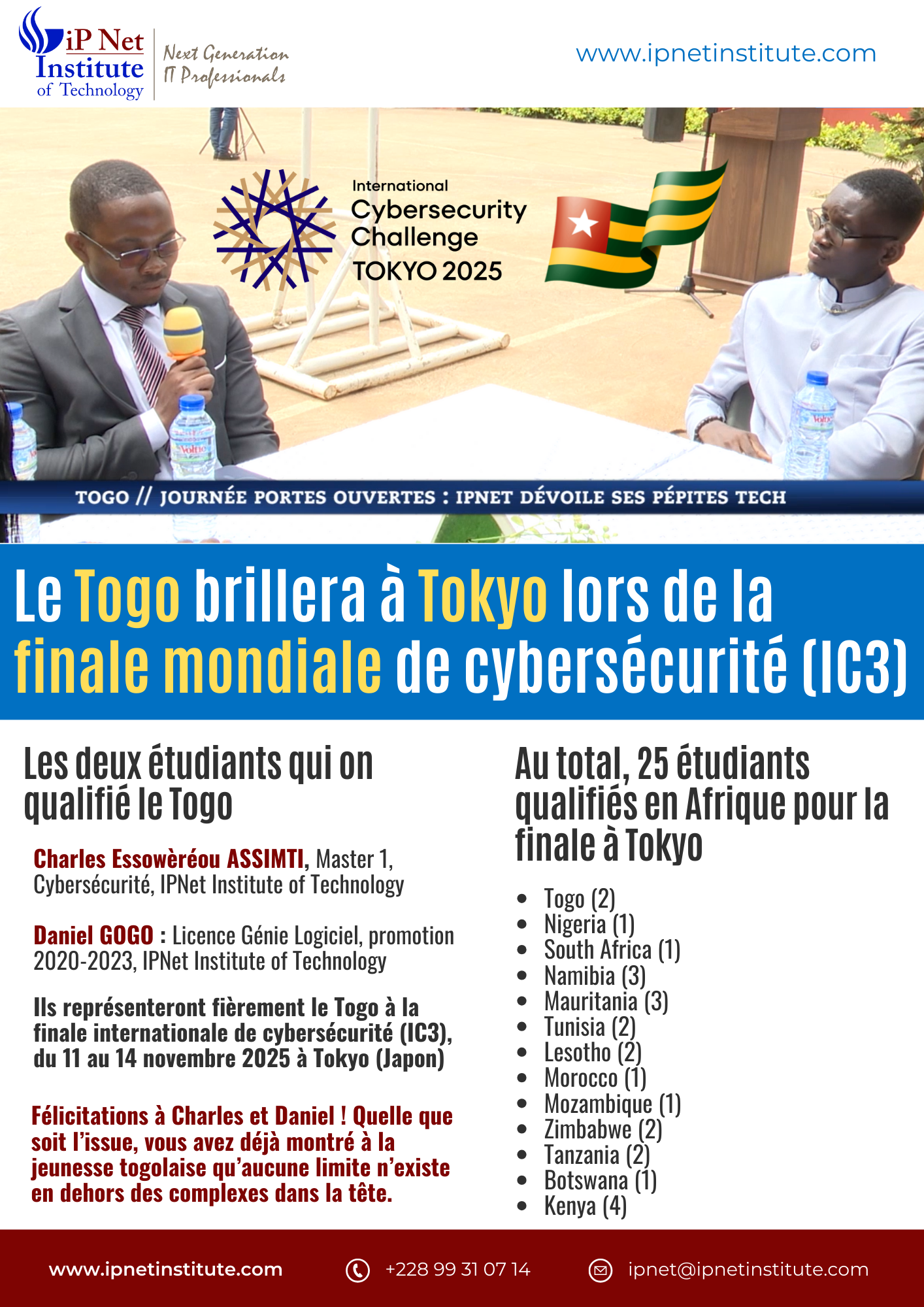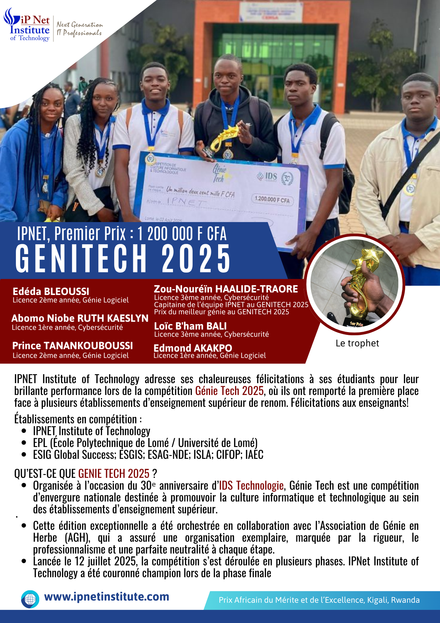Vous êtes un symbole de leadership, de l’ambition, de l’excellence, de la résilience et du sens du travail en équipe. Aller se mesurer dans des compétitions nationales, continentales et mondiales est une marque de confiance en soi. Toute l’équipe IPNET (Enseignants, Formateurs, Encadreurs sur les Travaux Pratiques et Projets Etudiants ainsi que les membres de l’Administration de I’Ecole) est fière de vous.